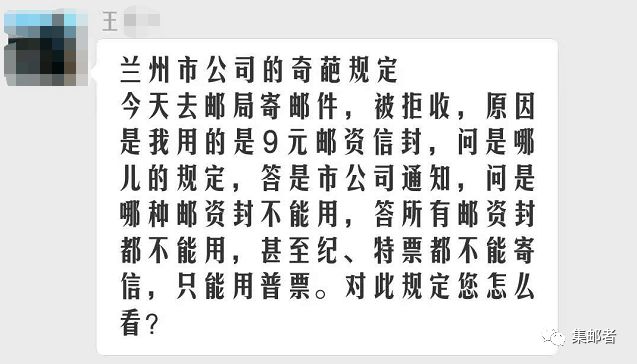 最近有多位邮友给集邮哥发来关于:中华全国集邮联会士王老师在兰州市西固区某邮局使用邮资封遭拒,不但邮资封不能用,甚至纪特邮票不能寄信,只能用普通邮票。