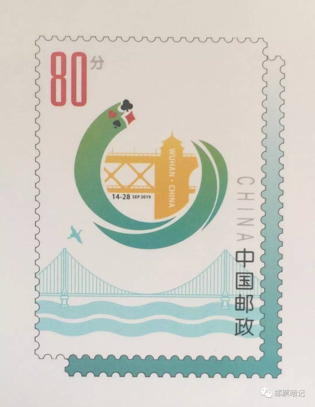 JP254邮资图由本次比赛的LOGO和武汉地标建筑——鹦鹉洲长江大桥构成,烘托出本次比赛“桥通天下,牌连四海”的主题。在邮资图外形上,则借鉴了经典纪念邮资片JP66《世界卫生组织成立50周年》的邮资图构图。采用前后2枚“邮票”错落叠压的方式,既能增加整体层次感,也是一种向经典致敬的表达。
