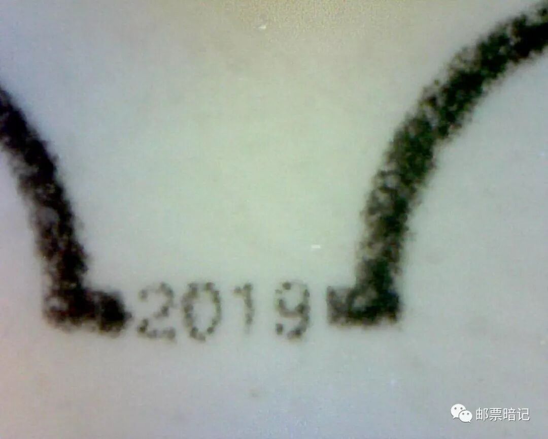 第二处在邮资图边框的下面左数第2个齿和上面右数第3个齿上,分别标有年份“2019”。