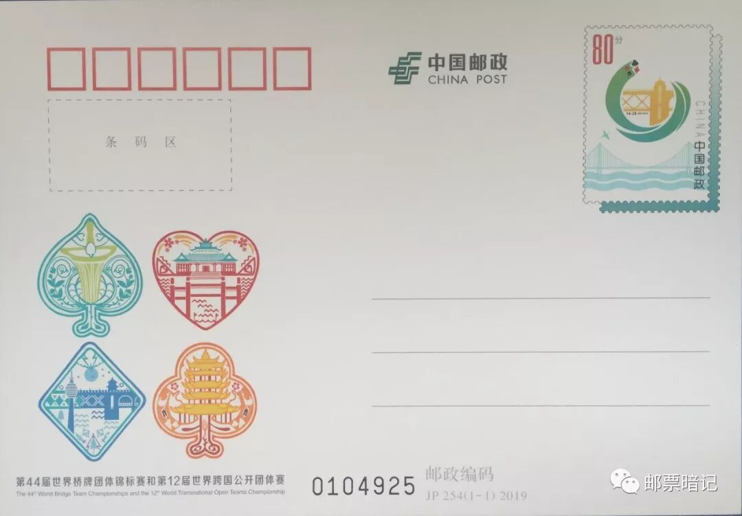 中国邮政定于2019年9月14日发行《第44届世界桥牌团体锦标赛和第12届世界跨国公开团体赛》纪念邮资明信片1套1枚。详情如下: