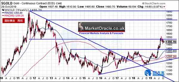 图为黄金周线走势图,图中显示黄金受阻于1530附近,未来或回调至此前关键阻力位1390附近,这意味着黄金可能在1400附近筑底,随后反弹走高,上方阻力位为前高1566美元,突破后或将进一步看涨至1800美元。