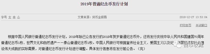 2018年12月27日发行计划发布,二猪币,建国70币,泰山币,三个纪念币完成了今年的发行计划。