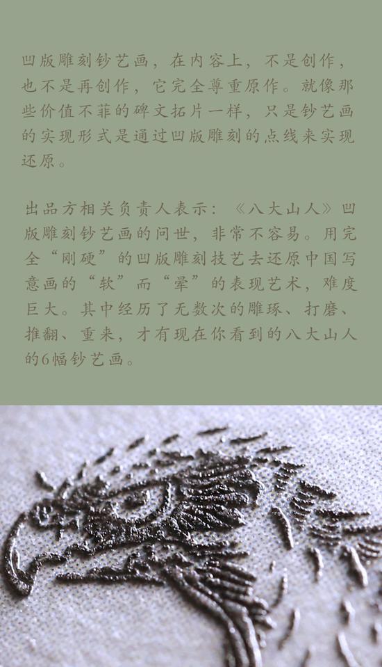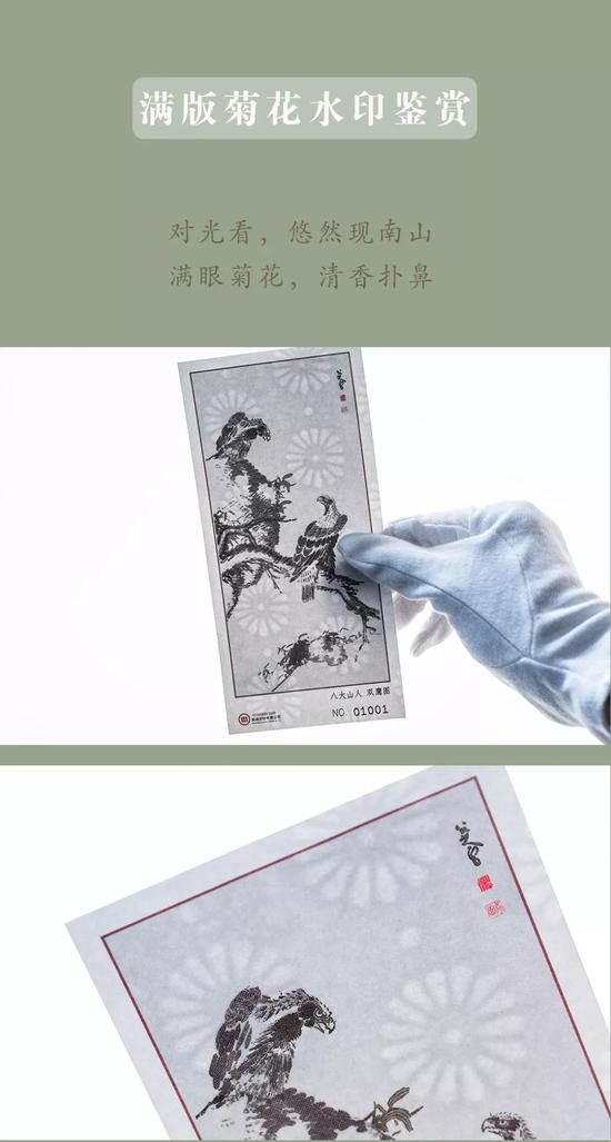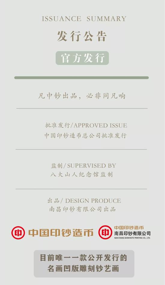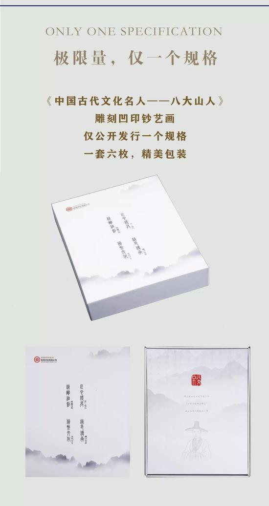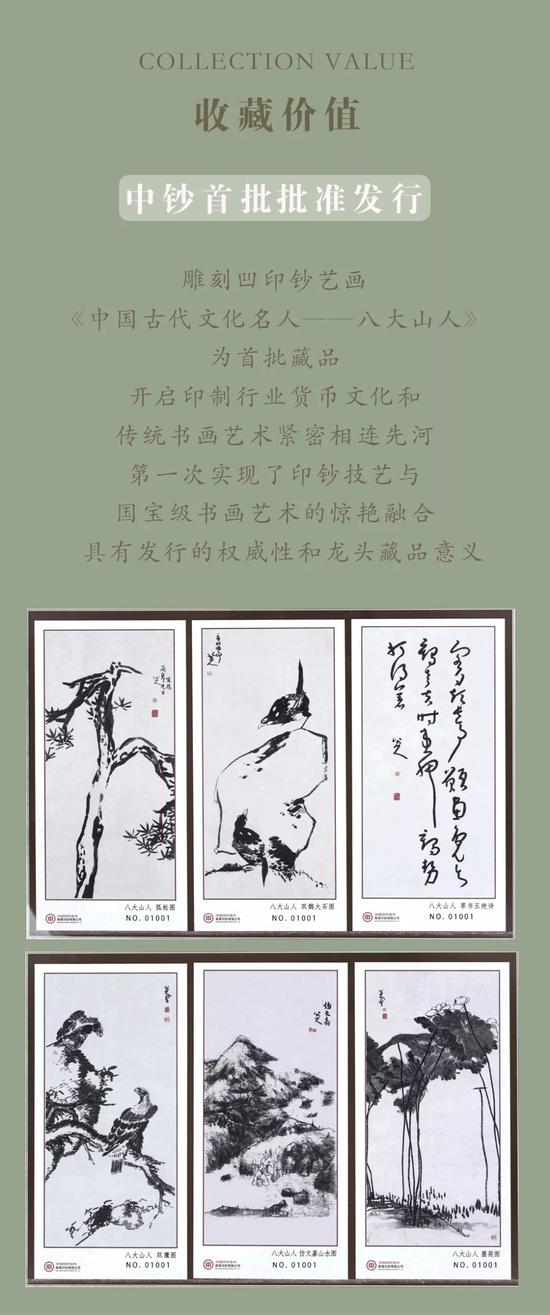 雕刻凹印钞艺画《中国古代文化名人——八大山人》,经中国印钞造币总公司批准,八大山人纪念馆监制,南昌印钞有限公司出品,今日12月9日正式公告发行。该套钞艺画藏品限量发行2000套,每枚均有独立编号,一套六枚,均为同号,并附同号收藏证书,极具收藏价值。