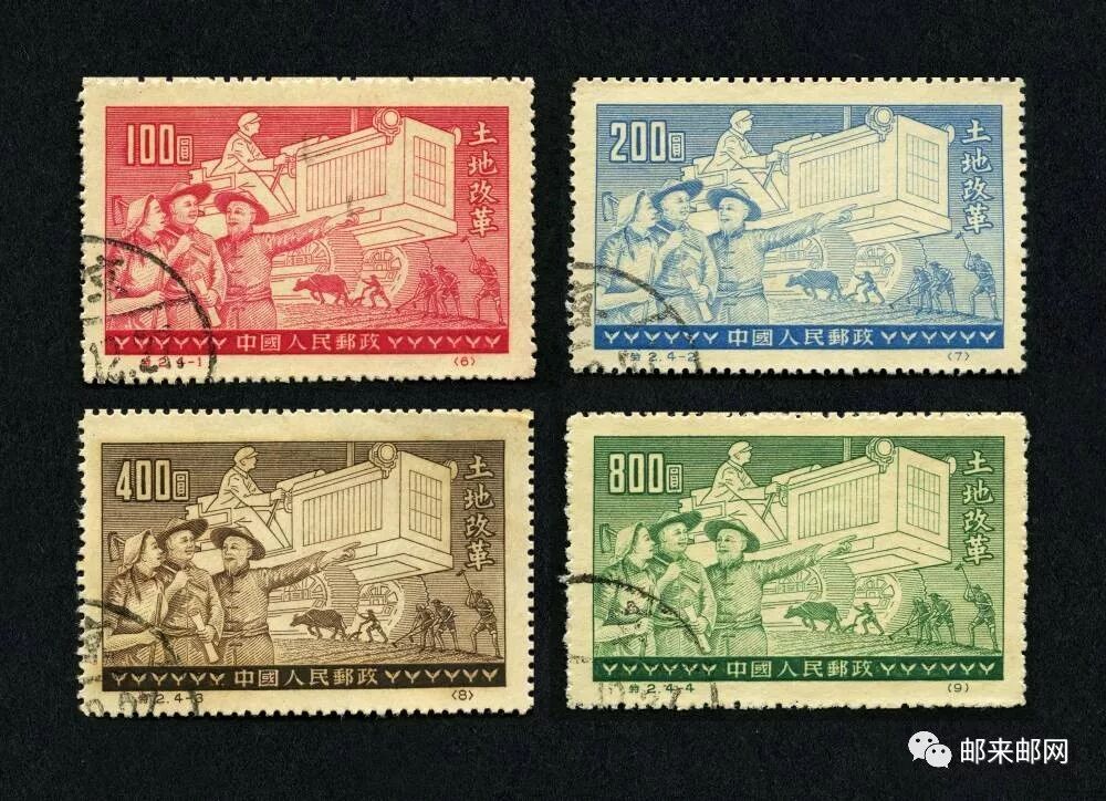 新中国成立后,为争取国家财政经济状况的根本好转,彻底清除封建土地剥削残余,1950年6月6日至9日,中共七届三中全会专门讨论了土改问题。6月30 日,由中央人民政府主席毛泽东颁布命令,公布施行《中华人民共和国土地改革法》。这次土改同解放战争时期党所规定的路线和政策,以及1947年10月所颁布的《中国土地法大纲》,基本精神一致,在具体政策上有很大变化。全国的土地改革从经济上彻底消灭了封建剥削制度,极大地提高了农民的政治觉悟,解放了农村的生产力,进一步巩固了工农联盟和人民民主专政,有力地促进了农业生产和整个国民经济的恢复和发展,并为以后开展的社会主义建设和农业的社会主义改造创造了有力条件。1952年1月1日,邮电部发行了这套《土地改革》特种邮票,全套4种,主图相同,表现出分得土地的农民,手持人民政府发给的土地证,以无限的喜悦和满腔的热情,在自己的那块土地上辛勤耕作的情景。