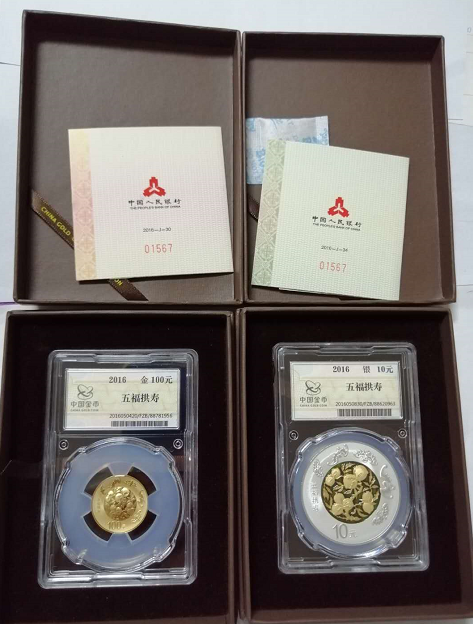 金总封装2016年五福拱寿金银币,4000元出,原价4200带发*票。