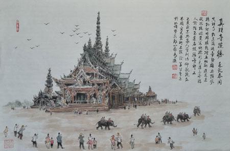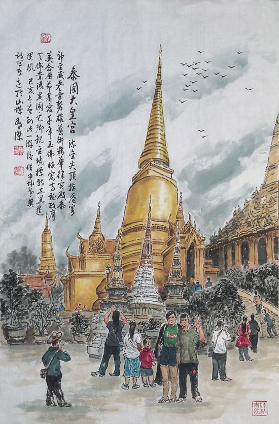 2020年1月19日上午,从北京头天回渝的女儿与孙娃,带上我与老伴,打车去重庆江北机场,11点半乘上去泰国的飞机,经过3个半小时后,飞机在曼谷廊曼机场降落,下飞机落地签证后步出机场,有专车接我们去曼谷市区酒店,沿途一路尽览泰国城郊风光,车行左道一直在高架桥下行进,热带的树林植被,低矮破旧的房舍建筑,泰国王的照片不时徐徐进入眼帘。车外艳阳高照,重庆来时穿的过冬衣服已全换掉,穿上短衣短裤像是进入夏季。 一个多小时后进入泰国曼谷市区,高耸宏伟的建筑,整齐林立的街道店面,大车、小车、摩托车,成群穿梭来往游人,构成泰国首都曼谷的大都市形象。 专车驶入曼谷阿玛瑞水门酒店办理入住,华丽的接待大厅,舒适的客房,楼上可远眺市区城市建筑风光,我们这次参加的是泰国曼谷+芭堤雅6日5晚半自助游,第一天是到曼谷是自游行动,下午4时住宿安排好后,女儿带我们逛街去附近的四面佛,这里是市中心繁华地带,人多车多,过天桥来到一宽阔的街道上,见有众多虔诚的青年男女跪成一片,在两座白色的塔前祈祷祭拜,引起观众注目与我心灵震憾,泰国人真有信仰啊!信佛的人民是值得尊重与信赖的。经过繁华热闹的商场,穿过两条街便看见金黄色的四面佛了,艳阳下音乐声中人头攒动,近看虔诚的男女们双手合掌握香闭目跪拜祈祷,据说拜四面佛很灵验,香港明星谢廷锋之母在此拜求生子就心想事成,成了还要回来还愿才灵验的,拜四面佛还须懂规矩的,慈、悲、喜、舍四面代表四种梵心,要心善勤修功德,不可急于求成,女儿也讲我们来此游观只是看客,不懂不能乱拜,观看了解泰国的风土人情也是长了见识。 女儿会英语,能与出租车司机会话,随后我们打车来到曼谷唐人街,看见中外游客很多,各色商场春节气氛浓浓,汉字招牌林立、中国福、禄、寿画像、对联供奉其间,各种工艺纸扎五彩纷呈,龙凰呈祥精美好看。热带水果价廉物美,各种中国美食呈现眼前,犹如回到中国故乡。唐人街华侨、华裔老板店员友好热情叫卖声不断,同祖同宗的泰国人与华人脸谱相近皮肤略稍黑都属亚洲人脸型,逛唐人街好似在中国家乡。 在唐人街打望看热闹,再品尝食街边美食鲜果,傍晚坐地铁回酒店,后又去附近逛曼谷夜市,见泰式按摩店林立,地摊上许多服装、工艺品来源于中国制造。但我们最喜欢吃的还是香蕉、荔枝与芒果。 1月20日早上8点,泰国导游阿一在大厅点名集合,游客主要是上海、北京、山东、江苏、广东、重庆、武汉等地的,男女老少游客共计约33位游客,大家提前都加了微信群,便于联系,待坐上旅行大巴后,阿一用流利的中文自我介绍,接着开始介绍泰国的历史、风土人情大意是:泰国位于东南亚半岛中央,古称堕罗钵底,居民为傣族,原住我国云南西南部,后渐迁涉到湄南河,湄公河沿岸,公元7世纪左右,征服近邻建立王朝,14纪后正式建立阿逾陀王朝,中国称之为暹罗,至今有6百多年的历史。 泰国是一个佛教国家,从国王下至百姓都信奉佛教,代代相传的传统宗教,也是泰国人的生活重心,4千7百万人口中,佛教徒占95%以上,据说全国有3万多所寺庙,天使之城的首都曼谷便有佛庙之都美称,佛教成为泰国国教,男子未婚前,须一周或一月时间托钵化食出家受戒修行……。大巴一路在乡镇路上行进,今天上午去参观美功铁道市场,这是乡民卖土特食材之地,火车未来时交易人流攒动拥挤不堪,火车来时赶紧收摊让道,这也是曼谷当地独一无二之乡场贸易特色矣。随后乘小船游丹嫩沙朵水上市场,机动扁舟在狹窄的水道上来往穿行,两边不时有水上小商铺叫卖,可停靠购物,是曼谷一大特色,当年香港片、火爆的007电影曾在此选景拍攝。 随后乘车来到金东尼人妖秀剧场,观看泰国人妖歌舞表演,俊美高挑的身段,优美的舞娑令人叹绝,娇美芳姿媚态可与真女人庇美,观看人妖们表演后留下一幅合影照作美好回忆纪念。 导游阿一讲,这里的人妖表演只是初级水平,更高级美艳的人妖秀在啥夜总会船上,我们因时间不待不能去看了。阿一讲泰国男少女多,人妖减掉了男人一部分名额,所以能实行一夫多妻制,开车的司机就娶了两个老婆呢,生话也和诣相安无事的。夜晚去食火烧排骨特色美味、芒果、菠萝饭,逛拉差达火车夜市景点,宽大的夜市灯火辉煌,人头攒动很是热闹,我与泰国阿一导游交流,他喜欢中国书画,我赠骏马画、山水画折叠画片纪念。 1月21日上午,乘车过湄南河后,随导游集体游泰国大皇宫、玉佛寺,大皇宫建筑为暹逻式风格,宫墙内外汇集了泰国历史文化绘画、雕刻和装饰艺术的精华。再脱鞋进入宏伟高大,富丽堂皇金玉璀璨,庄重森严的玉佛寺内参观,仰望合掌敬拜金身玉佛慈面像。这里是泰国历代王族举行重要仪式的场所,像泰国这样的佛教国家,宗教与王权合二而一,泰国王为佛像换衣仪式更为隆重。我最欣赏的是大皇宫玉佛寺的精美建筑、佛塔、佛像等雕刻艺术,还有长廊彩绘历史画卷,这代表了东南亚泰国的人文历史与独特的建筑艺术风格。 导游阿一讲泰国是资本主义国家,实行国王总理制,国王让平民百姓拥有属于自己的土地财产不受侵犯,民众免费看病住院、入托上学等,泰国人民有很高的幸福指数,这些福利保障,使泰国王成为人民的救世主,全国城乡只挂一幅像独尊,就是当今泰国王与王后。 泰国人信奉佛教,以慈善、诚信做人,社会治安良好,少有制造假冒伪劣产品害人,事