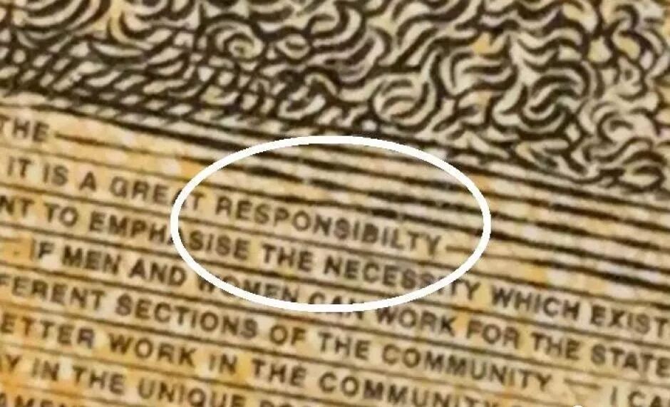 讲辞中“it is a great responsibility to be theonly woman here”的“responsibility”一字,少了第三个“i”,错误地并成“responsibilty”。由于讲辞中三次用到“responsibility”一词,所以相同错误在钞票上共出现了三次,这个错误只出现在50元钞票。