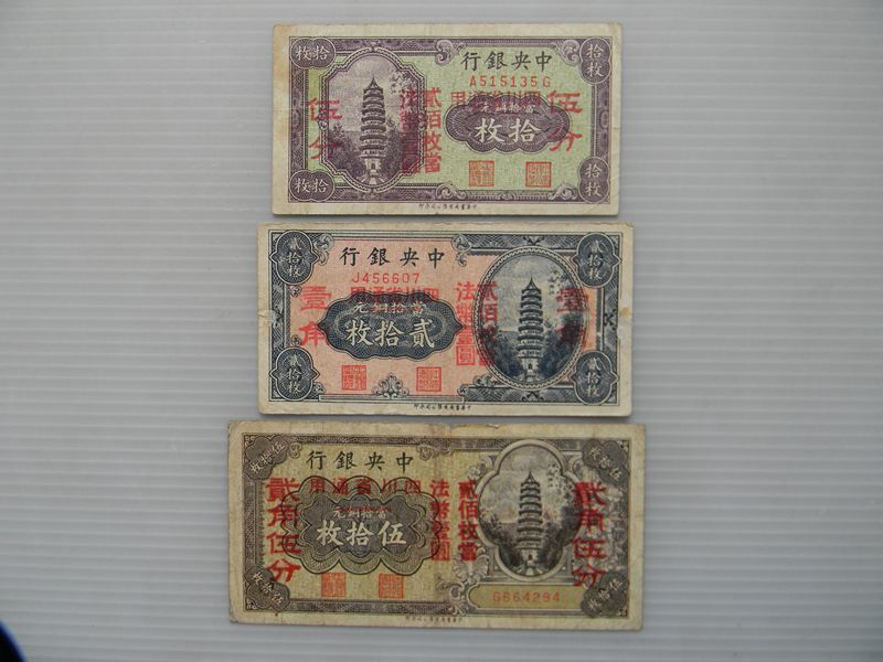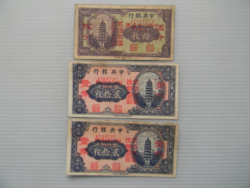 中央银行 十元,贰拾元,五十元, 共售 900元。 十元贰拾元 三张共售 400元