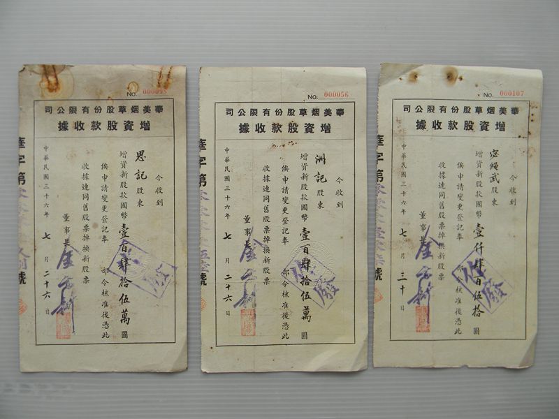 华美烟草股份有限公司, 售三张 售 100元。 光绪三年 售 100元,广西银行 售50元