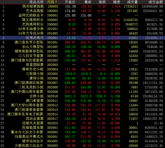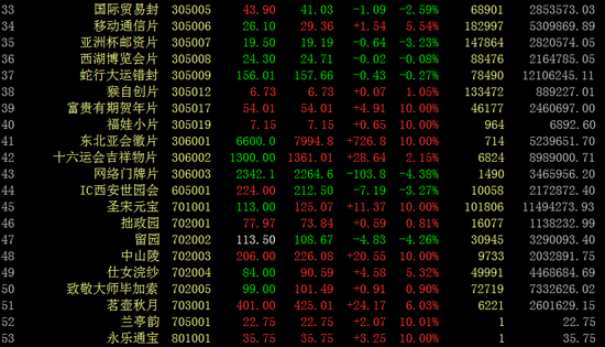 下跌品种中,唐诗小版下跌5.94%,古桥小版下跌5.78%,网络门牌片下跌4.38%,留园下跌4.26%,IC西安世园会下跌3.27%。